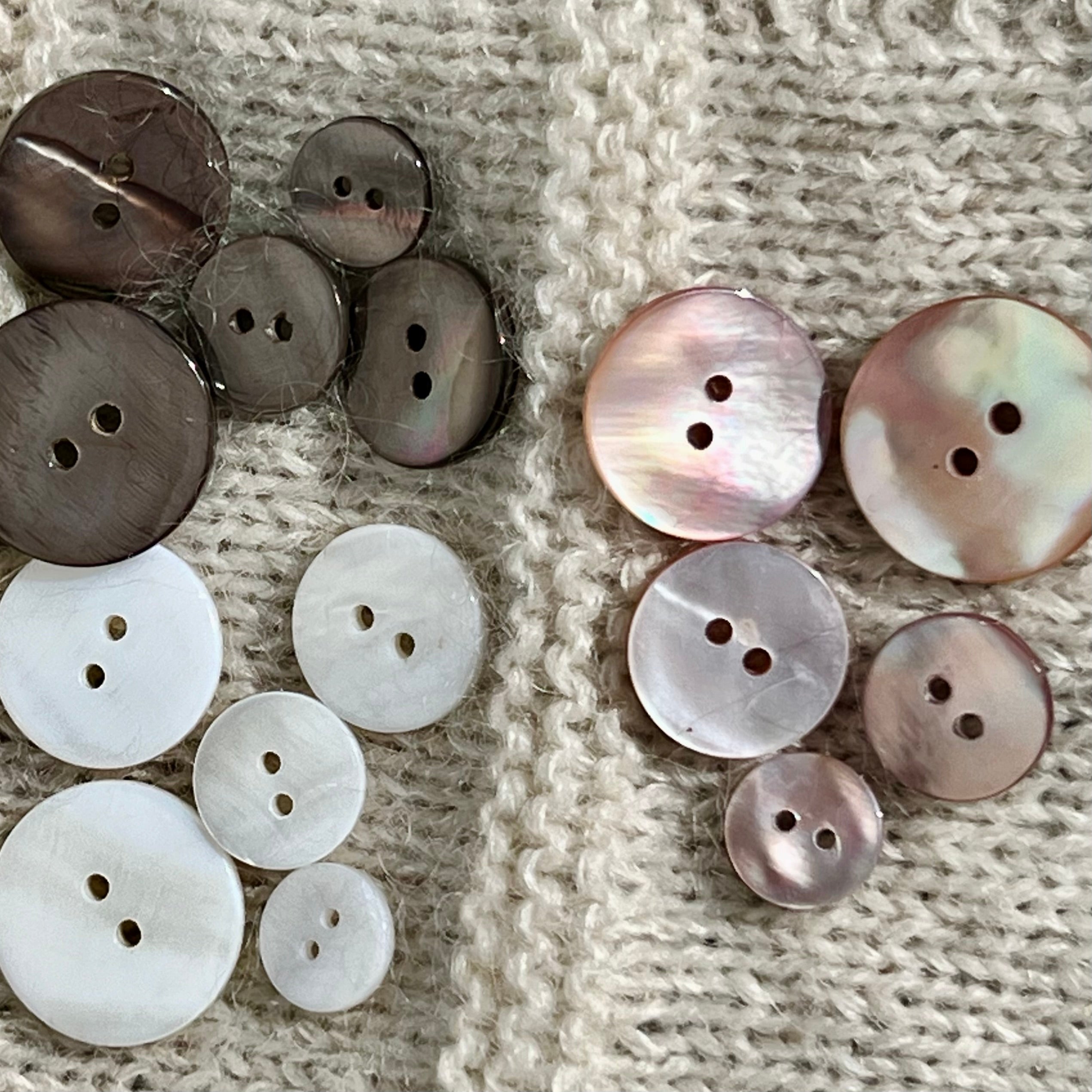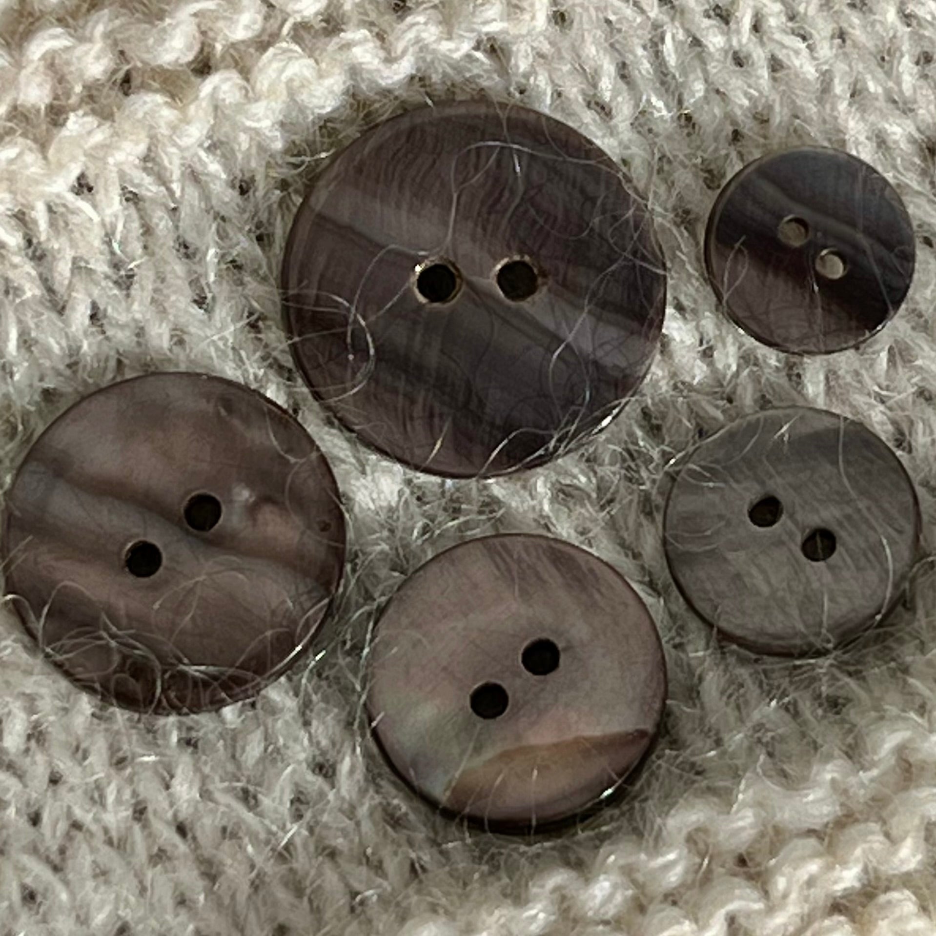 Denne perlemorsknap er fremstillet i solid perlemor i en varm grå nuance med et naturligt spil i overfladen. Hver knap har sit eget udtryk, da perlemor er et naturmateriale, hvor små variationere i farve og struktur er en del af charmen.