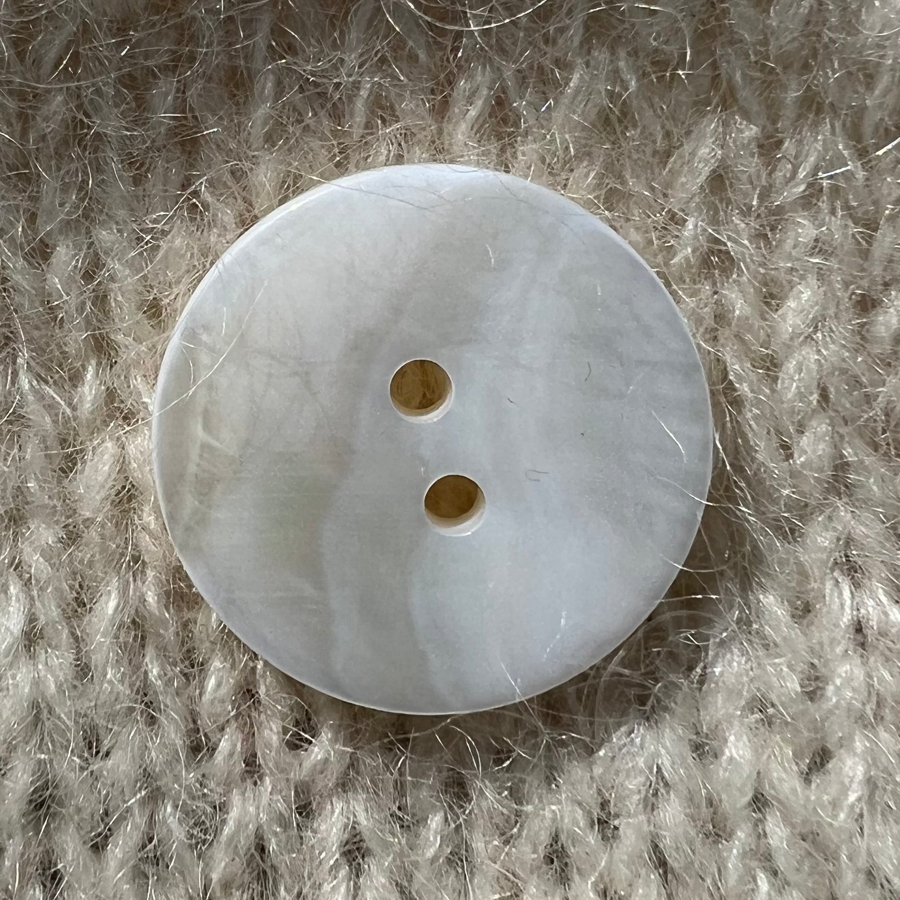 Denne perlemorsknap er fremstillet i solid perlemor i en blød, mild hvid nuance med et naturligt spil i overfladen. Hver knap har sit eget udtryk, da perlemor er et naturmateriale, hvor små variationere i farve og struktur er en del af charmen.